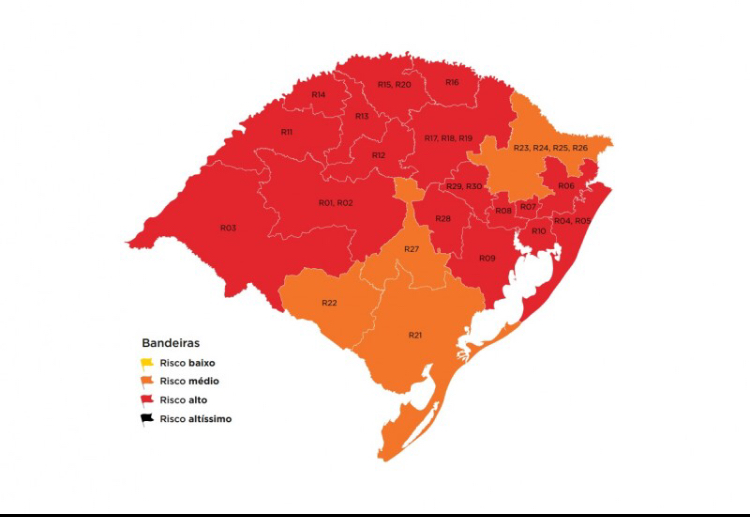 Ainda assim, a grande maioria das regiões segue em bandeira vermelha, ou seja, com risco alto para esgotamento da capacidade hospitalar e velocidade de propagação do vírus no Estado. As 17 regiões em vermelho somam 78,4% da população gaúcha, enquanto no mapa anterior eram 86% dos habitantes nas 19 regiões.