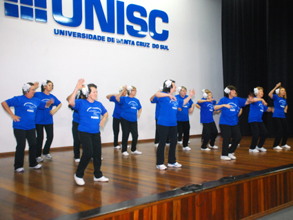 A integração entre os grupos, tanto os que estavam sobre o palco quanto os da plateia era visível, assim como a alegria, que tomou conta da tarde. O evento é uma realização do projeto Ações para o envelhecimento com qualidade de vida, desenvolvido na Unisc.