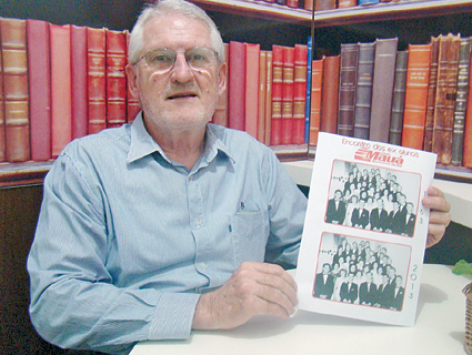 Pilz mostrando a foto com os colegas na formatura de 1963