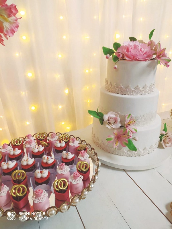 Carisa Duarte Cake Designer atua no ramo de bolo e doces personalizados há nove anos. Seu ateliê fica em Rio Pardo, na Rua Florentino Pedro Lisboa, 339, Bairro Jardim Boa Vista. A confeiteira afirma que a tendência atual é tudo ser muito simbólico para os noivos, como um simples bolo de cenoura com chocolate, que eles gostam de comer juntos no final de semana, ganhar uma roupagem sofisticada, composta por rendas e flores, e virar o bolo de casamento.