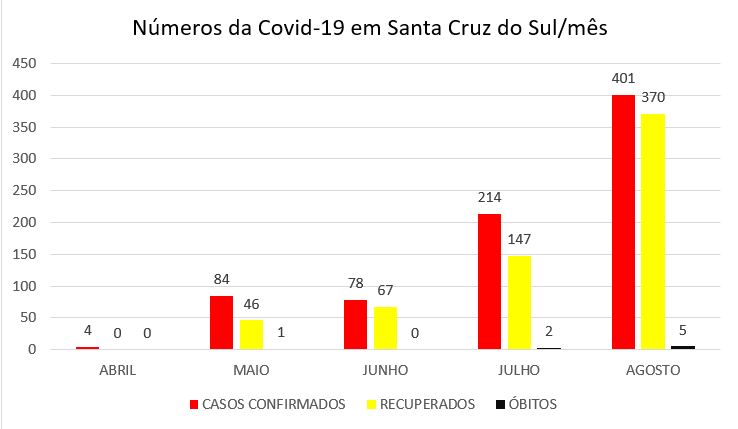 O número de recuperados da doença em Santa Cruz também vem crescendo. Dos 781 casos confirmados, 630 pessoas já estão recuperadas, ou seja, o número de pacientes com o vírus ativo no organismo é de 151 pessoas. Já o número de óbitos por Covid-19, no mês de agosto, foi superior aos meses anteriores, pois teve cinco mortes confirmadas, totalizando oito. De acordo com o Governo do Estado, a taxa de mortalidade em Santa Cruz a cada 100mil/habitantes é de 6.1, ficando entre as mais baixas no Rio Grande do Sul. Também nesta semana, a Região de Santa Cruz do Sul (R28) volta para a bandeira laranja no sistema de distanciamento controlado.