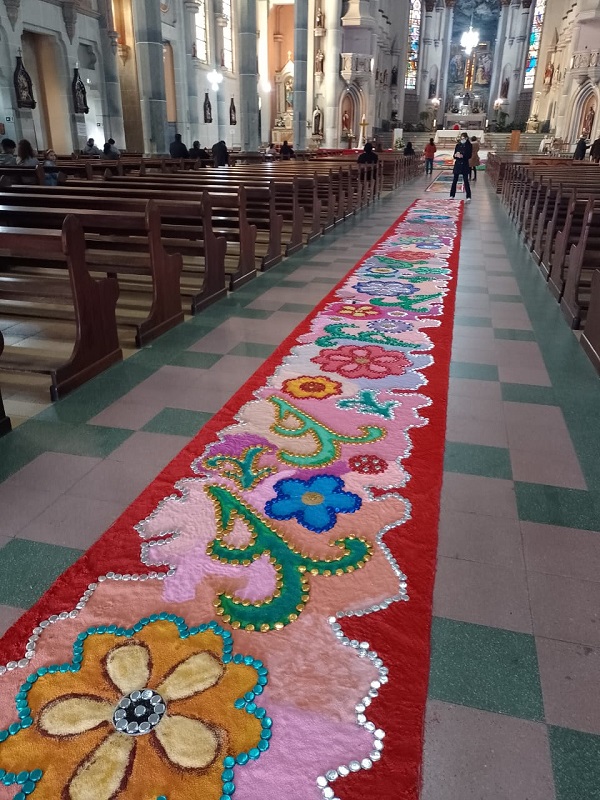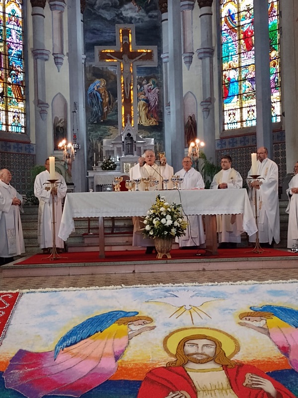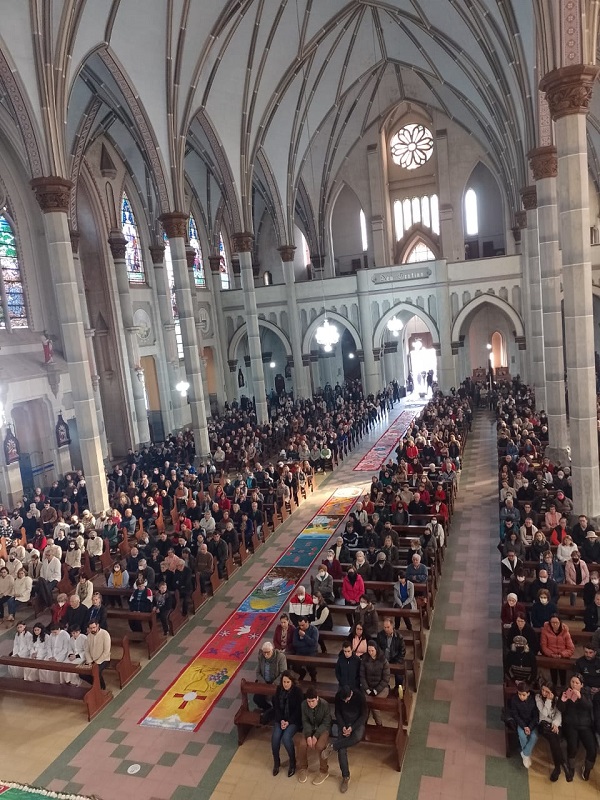 A manhã desta quinta-feira, 16, foi o dia de celebrar Corpus Christi. A tradicional procissão retornou este ano, interrompida há dois anos devido à pandemia de covid-19. A celebração foi realizada a partir das 9h com missa sob presidência do bispo dom Aloísio Dilli e com a presença dos padres da Diocese de Santa Cruz do Sul. No interior da Catedral São João Batista e no acesso à Igreja, os tapetes coloridos com seus símbolos religiosos faziam uma homenagem para Jesus Cristo. No interior da Catedral foram colocados dois tipos de tapetes, sob coordenação de Lucia Ertel, um artístico com figuras alusivas e outro da solidariedade, com doações que serão revertidas para os projetos da Pastoral Social, que posteriormente distribui aos necessitados.