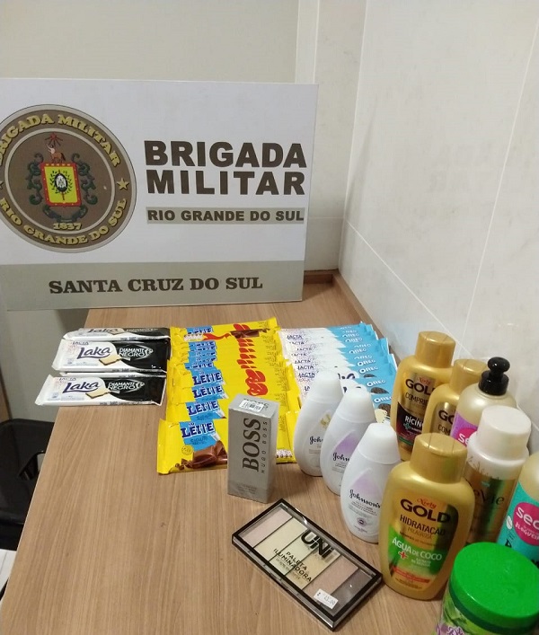 Nessa quarta-feira, 23, a Brigada Militar de Santa Cruz do Sul prendeu uma mulher, de 35 anos, na área central do município. Durante ações de polícia ostensiva, policiais militares foram avisados por uma comerciante de um furto num estabelecimento comercial. A partir desse momento, os policiais iniciaram as buscas, localizando a mulher com os seguintes objetos furtados: um estojo de maquiagem, um perfume, sete cremes, quatro xampus e três chocolates.