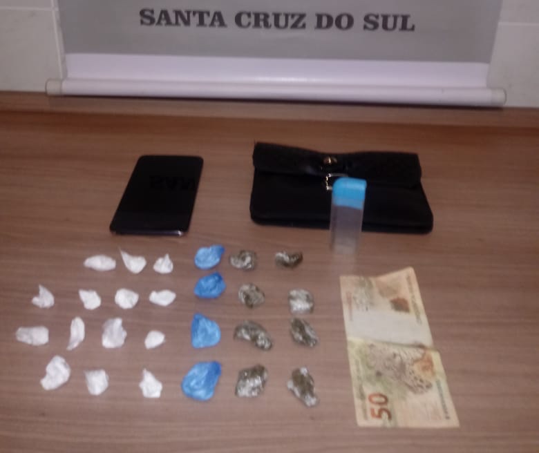 Os policiais flagraram a mulher próximo a um local conhecido pela comercialização de entorpecentes. Em seguida, foi realizada a abordagem e durante a busca pessoal foi encontrada uma bolsa preta, a qual continha oito porções de maconha (11,2 gramas), 18 porções de cocaína (11,2 gramas) e R$ 50.