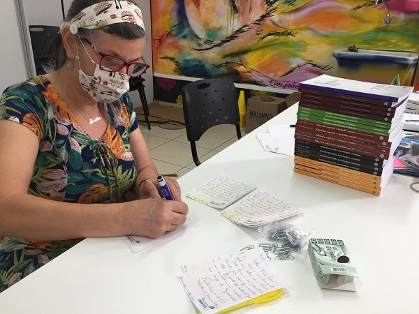 A acadêmica de ciências biológicas, Elovani Sinara Strassburger, que tem o sonho de ser professora, ajuda na confecção dos bilhetes e diz estar sendo uma experiência diferente e criativa, além de ser uma forma de atrair os leitores. “É bem bacana estar escrevendo à mão os bilhetes, pois irá atrair as pessoas e estes livros podem despertar o interesse pelos cursos”, relatou. Junto com o livro, estão anexados uma bala e um folder para as pessoas conhecerem os cursos oferecidos pela instituição de ensino.