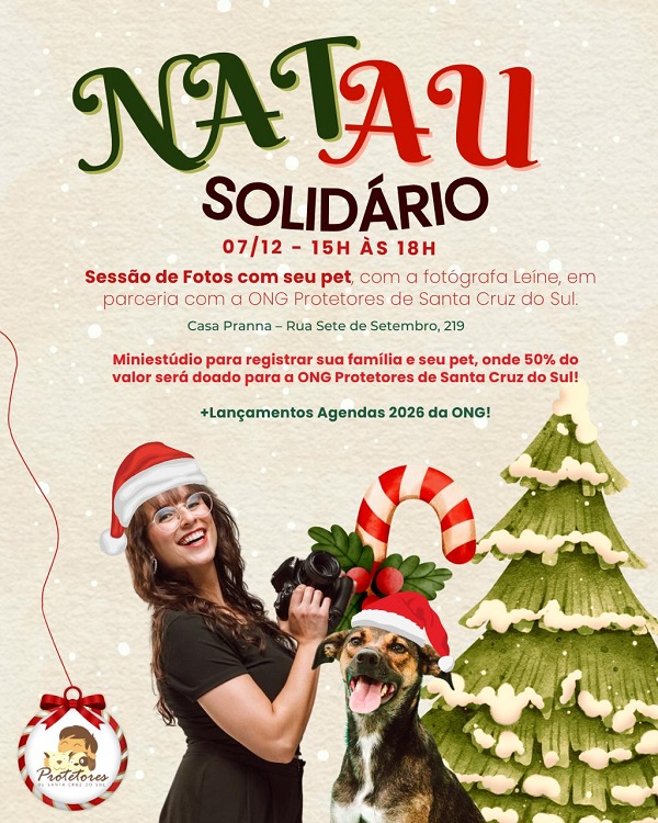 No local, estará à disposição um miniestúdio, para registrar as famílias e seus pets, e 50% do valor será doado para a ONG Protetores. O evento conta ainda com o lançamento das Agendas 2026 da ONG.