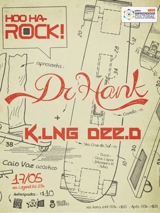 Na edição de amanhã, a Hoo Ha Rock será organizada em parceria com o Coletivo Fora do Eixo de Santa Maria e trará até Santa Cruz a banda de Canela, radicada em Porto Alegre, Dr. Hank. A banda cria seus sons próprios norteados pela surf music, com a pegada do soul e levada reggae. A Dr. Hank se evidencia pelas misturas improváveis de ritmos, se desprendendo de regras e grids modulares, buscando uma sonoridade única e acima de tudo autêntica. Vale a pena conferir o som da banda. Para quem quiser escutar suas músicas, acesse www.drhank.tnb.art.br e confira. Pelo lado santa-cruzense quem toca no evento é a K.lng Dee.D. A banda é formada pelos músicos Grace Bender, Gibran Sirena e Tiago Claro Campos e transita entre o rock e o eletrônico explorando novas sonoridades. Para conhecer o som da banda, acesse www.soundcloud.com/killingdeedee. Ainda acontece em formato acústico o show do músico santa-cruzense Caio Vaz, que traz no repertório suas belas composições que têm grande influência do folk rock e artistas como Neil Young, Bob Dylan, The Kinks, Belle and Sebastian e Little Joy. Conheça o som que o Caio Vaz faz em www.soundcloud.com/caiovazmusic.
