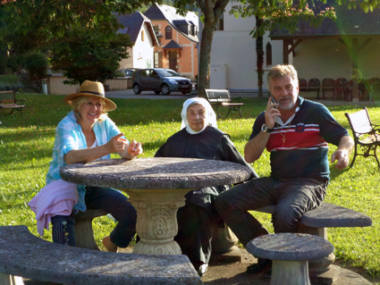 Márcia, Madre Paula e Mauro nos jardins do Petit Couvent, em Lourdes