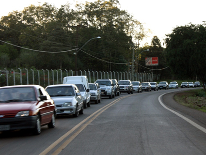 Moradores dos vários loteamentos de Linha Santa Cruz amargam a indigesta realidade de enfrentar um congestionamento de até 2,5 quilômetros todos os dias (foto) logo após o café da manhã. Após uma série de protestos, reuniões e reivindicações para que um viaduto seja construído no trevo do Fritz e Frida, no entroncamento da ERS-418 com a RSC-287, representantes da Amorlisc recorreram ao Ministério Público, ontem pela manhã, em busca de solução para o problema.
