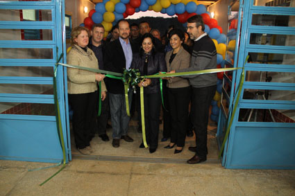 A diretora Berenice Schuster da Silva,o vereador André Scheibler, Campis, Kelly, a  secretária Ana Aranda da Educação e o deputado Fontana descerrando a fita inaugural