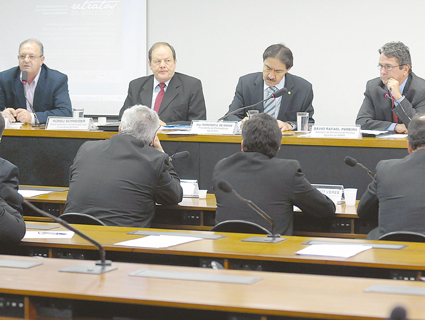 O presidente da Câmara Setorial do Tabaco, Romeu Schneider, tendo ao lado Antonio Rovaris, secretário de Politicas da Contag e de outro, o presidente da Comissãode Agricultura da Câmara, Raimundo de Matos e o Assessor da Secretaria de Política Agrícola do MAPA, Sávio Pereira.