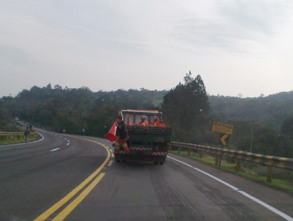 Nossa equipe de reportagem flagrou na tarde de sábado, 28, na RSC 287 proximidades do Pinus Parque Hotel, uma severa imprudência de trânsito e de trabalho. Funcionários do Grupo Serveng, proprietário da Santa Cruz Rodovias, recolhiam os cones de sinalização do meio da pista – três sentados na carroceria e um de pé no pára-choque se segurando com uma mão e recolhendo os cones com a outra. Tudo isso com o caminhão em movimento e sem nenhum equipamento de proteção. Fica o registro.