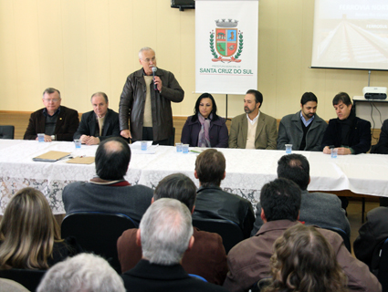 Na mesa oficial Mário Rabuske, Airton Artus, Raul Carrion, a prefeita Kelly, Sergio e Marcelo Moraes e Edson Brum, em audiência realizada em Santa Cruz no dia 5 de agosto de 2011 para debater o traçado da FerroSul