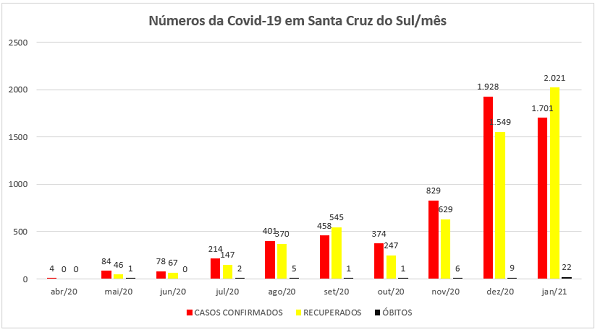 No gráfico é possível perceber o aumento dos casos nos meses de dezembro e janeiro – os mais críticos até o momento. Apenas dezembro teve 1.928 casos confirmados, e recuperados eram 1.549 pacientes. Já no mês de janeiro, apesar de ter sido confirmado um número elevado de casos na primeira quinzena, a situação recuou e os novos registros diários caíram de 50 para uma média de 20 casos por dia. Estes números começam a dar um sinal de estabilidade da pandemia apesar de o mês de janeiro ter registrado o maior número de óbitos até agora: foram 22 mortes, 13 a mais que dezembro, que registrou nove mortes.