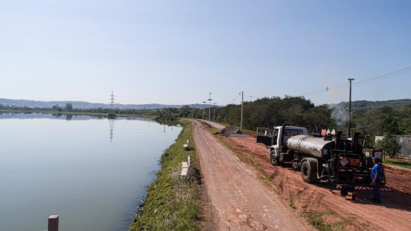 Com os últimos dias de tempo seco, as obras do Complexo Turístico do Lago Dourado também estão em ritmo acelerado. De acordo com o secretário de Planejamento, Orçamento e Gestão, Daniel Feuerharmel, atualmente estão sendo realizadas correções pontuais, em uma extensão de três quilômetros. “Já foi executada a base. Estão sendo aplicados rachões e enleivados os talubes no entorno”, explicou.