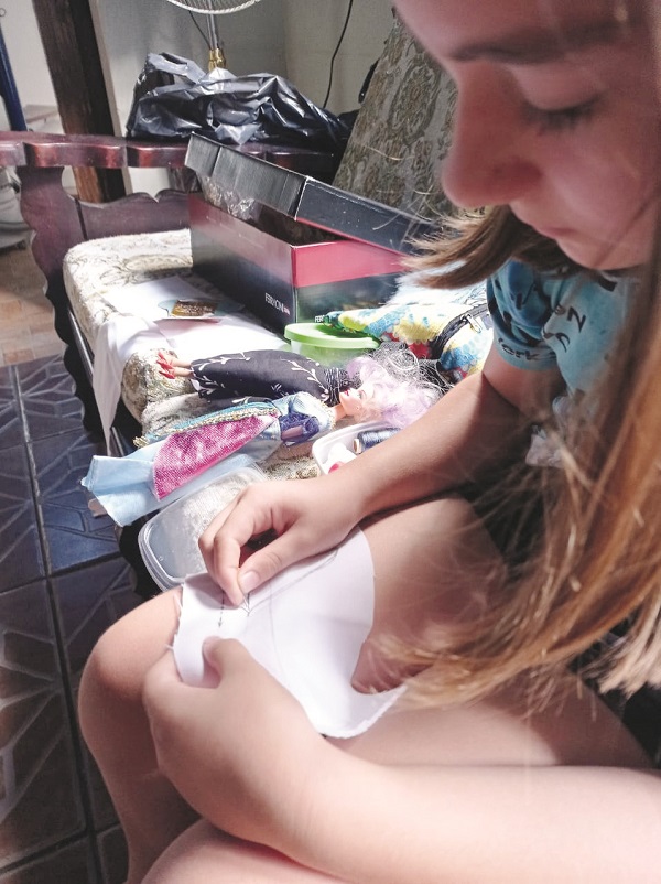 No curso, as crianças aprendem a cortar, costurar a mão e pregar botões, colchetes e pedrarias. Devido às medidas de prevenção, neste ano, a professora Valquíria precisou adaptar o formato das aulas. “Gravo vídeos ensinando os pontinhos e outras técnicas e elas treinam em casa para não ficarmos muito próximas”, sublinha.