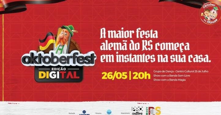 Muita animação e atrações variadas marcaram os primeiros dias de transmissão da 1ª Oktoberfest Digital, promovida pela Associação de Entidades Empresariais de Santa Cruz do Sul (Assemp), com financiamento da Secretaria da Cultura do Estado do Rio Grande do Sul, via Pró-Cultura RS, e patrocínio da Stock Med. A primeira parte da programação do evento aconteceu entre os dias 19 e 22 de maio. A partir desta quarta-feira, 26, as atrações continuam e seguem até sábado, 29 de maio, sempre das 20h às 22 horas, pelo perfil do Facebook (https://www.facebook.com/oktoberfestsantacruz) e pelo canal oficial da festa no YouTube (https://bit.ly/3omHW43).