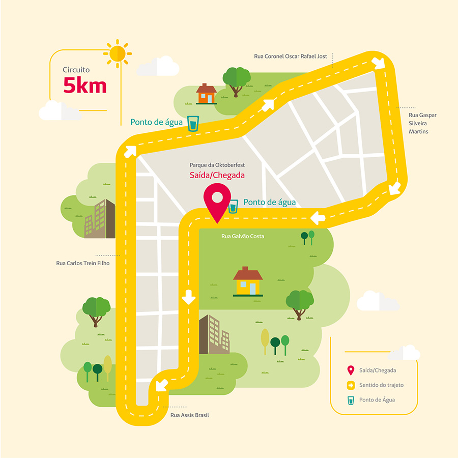 Para os adultos, o trecho de cinco quilômetros inicia na Rua Galvão Costa até a Rua Ernesto Alves. Na sequência, os atletas devem seguir em linha reta até a Rua Júlio de Castilhos, dobrando à esquerda na Rua Assis Brasil. Após, viram à direita na Rua Ramiro Barcelos. Ao entrarem na Rua Carlos Trein Filho, os participantes seguem até a rótula, continuando o percurso pela Rua Coronel Oscar Jost. Neste trecho dobram à direita em direção a Rua Gaspar Silveira Martins, seguindo até a Rua Galvão Costa e chegando novamente à frente do Parque da Oktoberfest.