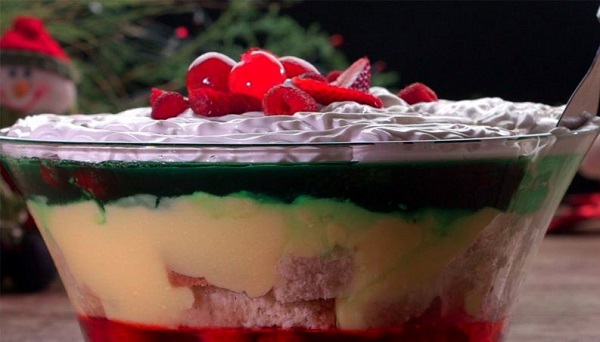 Dissolva a gelatina vermelha em metade da água quente e depois adicione metade da água fria. Repasse a mistura para um refratário grande e fundo e acrescente as frutas vermelhas. Leve à geladeira por 1 hora. Corte o bolo ao meio e, em seguida, fatie as duas metades em pedaços iguais. Depois, faça cubos uniformes com todas as fatias. Coloque os pedaços de bolo por cima da gelatina vermelha endurecida e regue com o vinho xerez. Cubra com o creme de confeiteiro e faça uma camada com mais frutas vermelhas picadas. Leve à geladeira por 10 minutos. Dissolva a gelatina verde no restante da água quente e depois adicione o restante da água fria. Despeje a mistura por cima do pavê e leve novamente à geladeira por 1 hora. Decore o pavê com chantilly e algumas frutas vermelhas. Sirva a seguir.