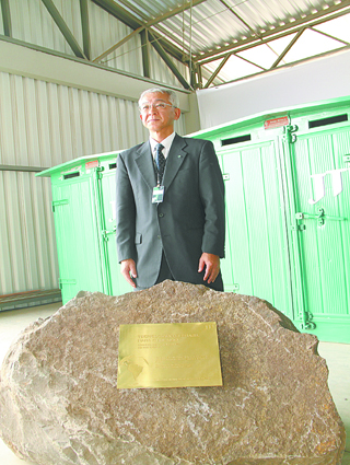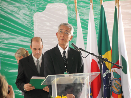 O presidente Mitsuomi Koizumi junto à placa da inauguração do complexo e algumas das estufas de pesquisa: tecnologia do Brasil para o mundo