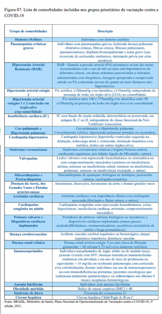 De acordo com a diretora do Centro Estadual de Saúde, Cynthia Molina Bastos, comorbidades são doenças ou condições de saúde que aumentam o risco de condições mais graves. A estimativa no Rio Grande do Sul é de 1.150.997 pessoas com pelo menos alguma das seguintes comorbidades: diabetes, hipertensão arterial ou pulmonar, pneumopatia crônica grave, insuficiência cardíaca, cardiopatias, síndromes coronarianas, valvopatias, arritmia cardíaca, próteses valvares ou dispositivos cardíacos implantados, doença cérebro vascular, doença renal crônica, imunossuprimidos, anemia falciforme, obesidade mórbida, síndrome de down e cirrose hepática.