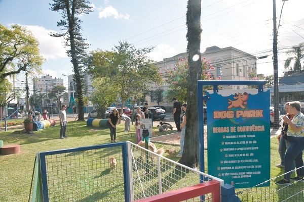 O domingo de tempo estável e temperaturas amenas formou o clima ideal para famílias se deslocarem ao centro da cidade para tomar chimarrão, comer um lanche e confraternizar. Na Praça da Bandeira, um novo espaço chamou a atenção. Localizado na lateral direita do Palacinho, com acesso pela rua Tenente-Coronel Brito, o Dog Park, finalizado nesta semana, foi oficialmente liberado para uso de cães e seus tutores. A inauguração foi feita ao fim da tarde, pela prefeita Helena Hermany e secretários municipais, enquanto a comunidade já explorava a área, voltada à recreação de cães de pequeno, médio e grande porte.