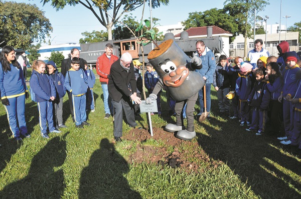 Junto com o Afubrinha e os alunos do AABB Comunidade, o presidente da Afubra e o secretário de Meio Ambiente realizaram o plantio da muda de ipê amarelo