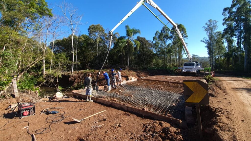 Mais uma ponte está praticamente concluída. Nesta semana, a Secretaria de Obras e Infraestrutura realizou a concretagem da ponte da Estrada Geral de Linha Araçá, no distrito de Monte Alverne.