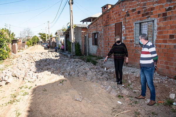 No Bairro Santa Vitória, Helena e Elstor acompanharam, junto com o secretário municipal Edmar Hermany e o diretor Gerson Vargas, os trabalhos de pavimentação que estão sendo realizados nas ruas Professora Alice Simões Pires e Luís Gama. A primeira delas, muito utilizada por ônibus para acessar o Bairro Harmonia, será asfaltada. Já a segunda está recebendo paralelepípedos que foram retirados do Centro. Ambas as vias estavam em péssimas condições.