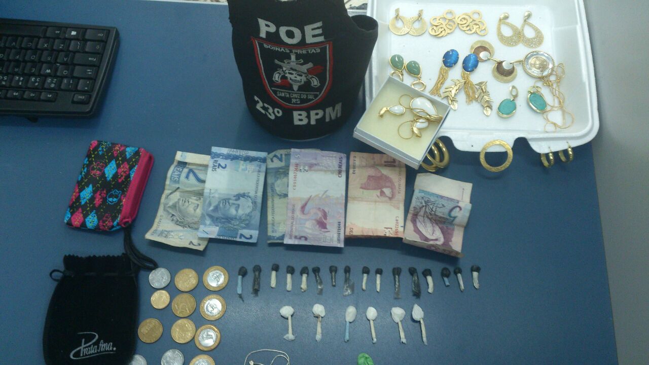 Diogo da Silva Araujo foi flagrado pelos policiais na rua conhecida como “Beco dos Cachorros”, no bairro Pedreira. Ele estaria oferecendo semijóias a uma mulher. Ao ser abordado, além do material, foi encontrado em seu bolso uma niqueleira contendo 16 pedras de crack e sete porções de cocaína, além de R$ 33,60.