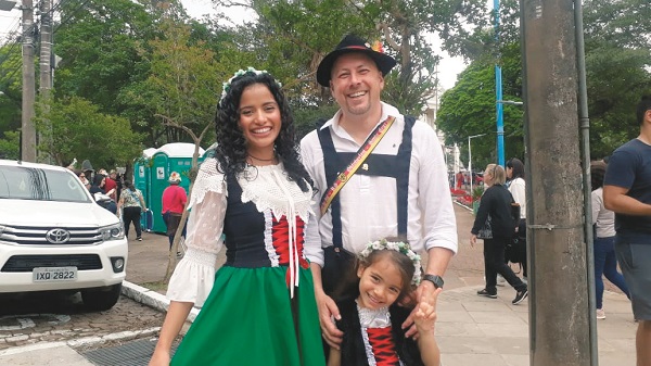 “Aprecio muito o entusiasmo, alegria e a dança na Oktoberfest. Participo do desfile desde 2000 quando vinha no chão pelo Centro Cultural 25 de Julho desde 2000 e em carro alegórico desde 2018. Desfilar sentada foi um jeito de continuar participando. O desejo de desfilar foi recebido com carinho pelo diretor artístico, Sérgio Ávila. A Oktoberfest, para mim significa alegria, encontro de familiares e amigos. Torci muito que o tempo estivesse bom, deu certo, e pude reconhecer as pessoas na calçada e acenar. Desfilei no carro que simboliza o coração e a família, que significam a essência da vida, e são sentimentos importantes. É preciso valorizar isso. Emoções movem as pessoas. O fato de ser idosa, usar andador e desfilar tomando analgésico, inspira outras pessoas a fazer o mesmo e ter uma expectaiva de vida com amigos em volta. Assim se estabelece uma relação que alimenta eu mesma e o público que conhece minha história. A cada desfile, me torno mais conhecida. Isso deve ser por causa das redes sociais. Em 2018 procurei o Sérgio dizendo que eu gostava de dançar e que os paralelepípedos poderiam causar queda. Ele se sensibilizou e sempre dá lugar de destaque para mim. Tem sido assim nas Oktoberfest e Chiristkindfest que ele desenvolve”, contou emocionada Brunilda.