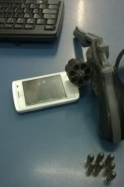 O homem levava na cintura um coldre com um revólver calibre 32 e sete munições intactas. Ele foi preso em flagrante e apresentado na delegacia de polícia.