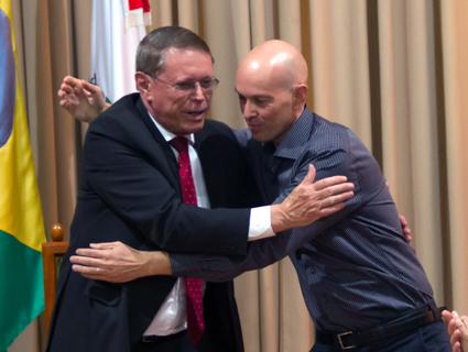 Prefeito Telmo Kirst e secretário João Wenzel: abraço para comemorar o pagamento do piso ao magistério