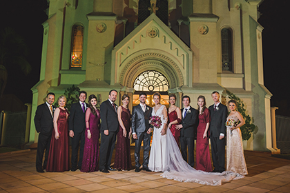 Os noivos entre padrinhos e madrinhas e a dama de honra