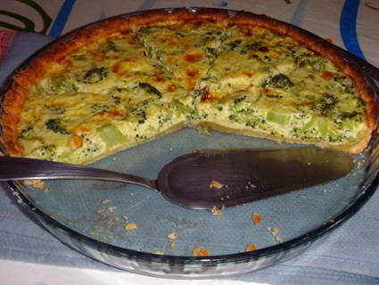 Numa tigela, misture os brócolis refogados aos demais ingredientes. Recheie a massa com essa misture e asse por 25 minutos ou até ficar firme. Desenforme e sirva.