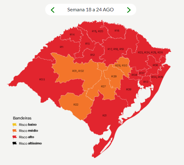 Divulgada nesta sexta-feira, 14, pelo Governo do Estado a 15ª atualização do Distanciamento Controlado. A região de Santa Cruz do Sul, R28, mantém novamente a bandeira laranja. O mapa preliminar da rodada traz 16 regiões classificadas com alto risco epidemiológico de Covid-19, recebendo bandeira vermelha. As outras cinco regiões ficaram com risco médio (bandeira laranja). As bandeiras definitivas serão divulgadas na segunda-feira, 17.