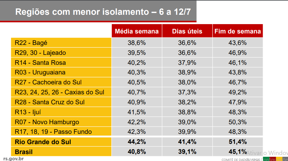 A partir do monitoramento de aplicativos móveis em celulares, com base em dados disponibilizados pela empresa InLoco, o trabalho apontou que as melhores médias estão justamente nas regiões sob bandeira vermelha (risco alto). É o caso das áreas de Pelotas (46,7%), Capão da Canoa (45,8%) e Porto Alegre (45,7%). Os maiores alertas estão relacionados com as regiões de Bagé (38,6%), Lajeado (39,5%), Santa Rosa (40,2%) e Uruguaiana (40,3%).