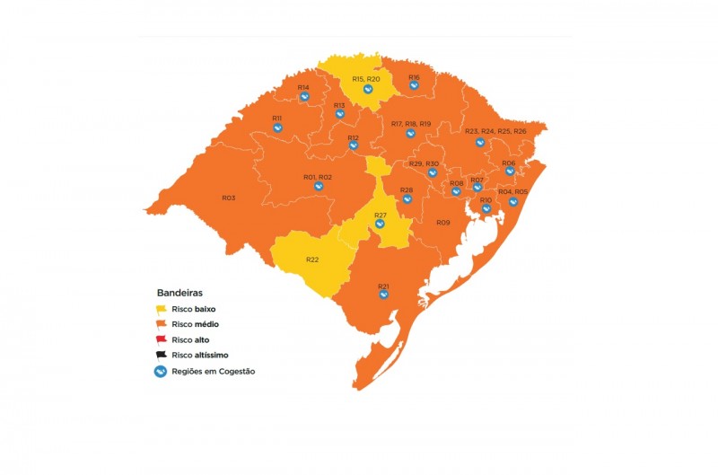 A mudança é entre Pelotas, que estava na amarela e passa para laranja, e Cachoeira do Sul, que migra para amarela, somando-se a Bagé e Palmeira das Missões, que já estavam no menor nível de restrição previsto no sistema de bandeiras do Estado.