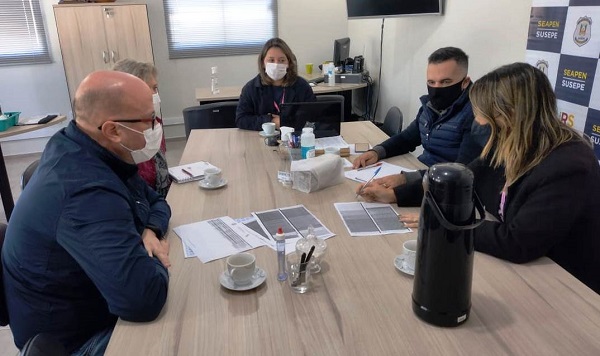 Integrantes da equipe da Unidade de Cooperativismo da Emater/RS-Ascar de Santa Cruz do Sul e representantes da 8ª Delegacia Penitenciária Regional (DPR) estiveram reunidos na quinta-feira, 27, para nivelar o cronograma de entregas dos produtos da Agricultura Familiar na Chamada Pública da Secretaria Estadual de Agricultura, Pecuária e Desenvolvimento Rural (Seapdr), por meio do Programa de Aquisição de Alimentos (PAA), para doação simultânea à Superintendência dos Serviços Penitenciários (Susepe). Participaram da reunião os extensionistas rurais Anderson Junqueira e Cinara Kanitz, a delegada penitenciária regional Samantha Longo, o delegado penitenciário regional adjunto Andreo De Quadros Camargo e a chefe do setor administrativo da Delegacia Penitenciária Regional, Jeruza Nunes.