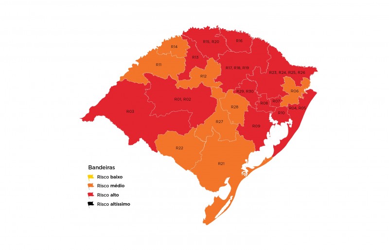 As regiões Covid de Novo Hamburgo, Capão da Canoa, Canoas e Ijuí já haviam sido classificadas como risco alto na rodada vigente e, neste mapa preliminar, seguem em vermelho. Unem-se a elas as regiões de Caxias do Sul, Uruguaiana, Erechim, Palmeira das Missões, Porto Alegre, Passo Fundo, Guaíba, Santa Maria e Lajeado.