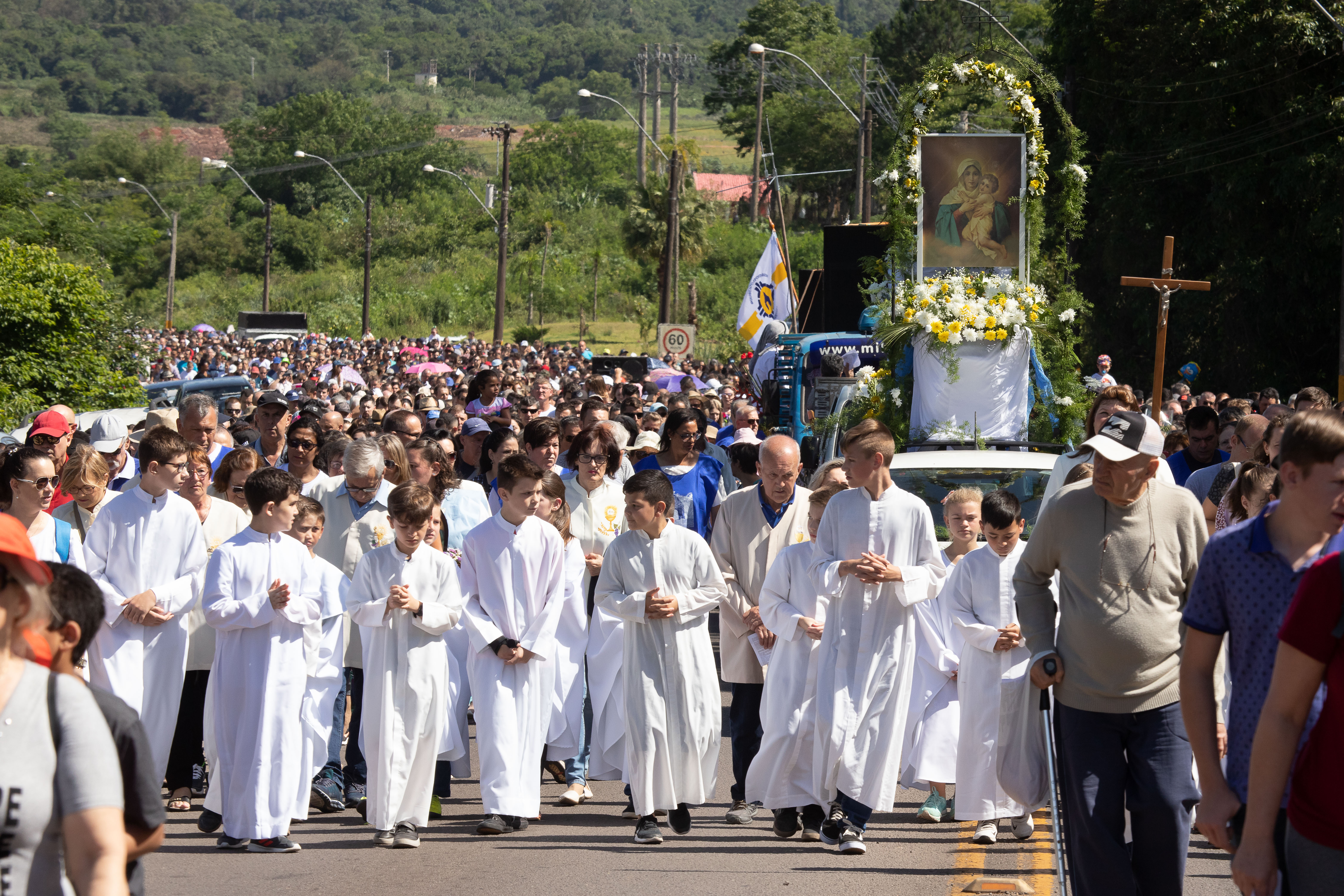 O domingo ensolarado reuniu cerca de 35 mil pessoas na 43ª Romaria ao Santuário de Schoenstatt em Santa Cruz do Sul. Com o lema “Com a Mãe e Rainha, vamos ao encontro de Jesus”, a procissão contou com a participação de fiéis vindos de diversos municípios da região que buscaram fortalecer a fé e agradecer pelas graças alcançadas. O evento religioso teve início às 8h30, em frente à Igreja São José, no Bairro Goiás. Acompanhando a imagem de Nossa Senhora de Schoenstatt, os fiéis seguiram pela Avenida Gaspar Bartolomay e após pela BR 471, no Bairro Bom Jesus até o Santuário. Um grupo de romeiros vindos pela ERS-409, da Igreja Santa Tereza, de Vera Cruz se juntou a peregrinação. Cantos e orações foram feitos durante o percurso de 2,8 quilômetros. Na chegada, uma missa campal foi ministrada pelo Bispo da Diocese de Santa Cruz do Sul, Dom Aloisio Dilli e por sacerdotes.