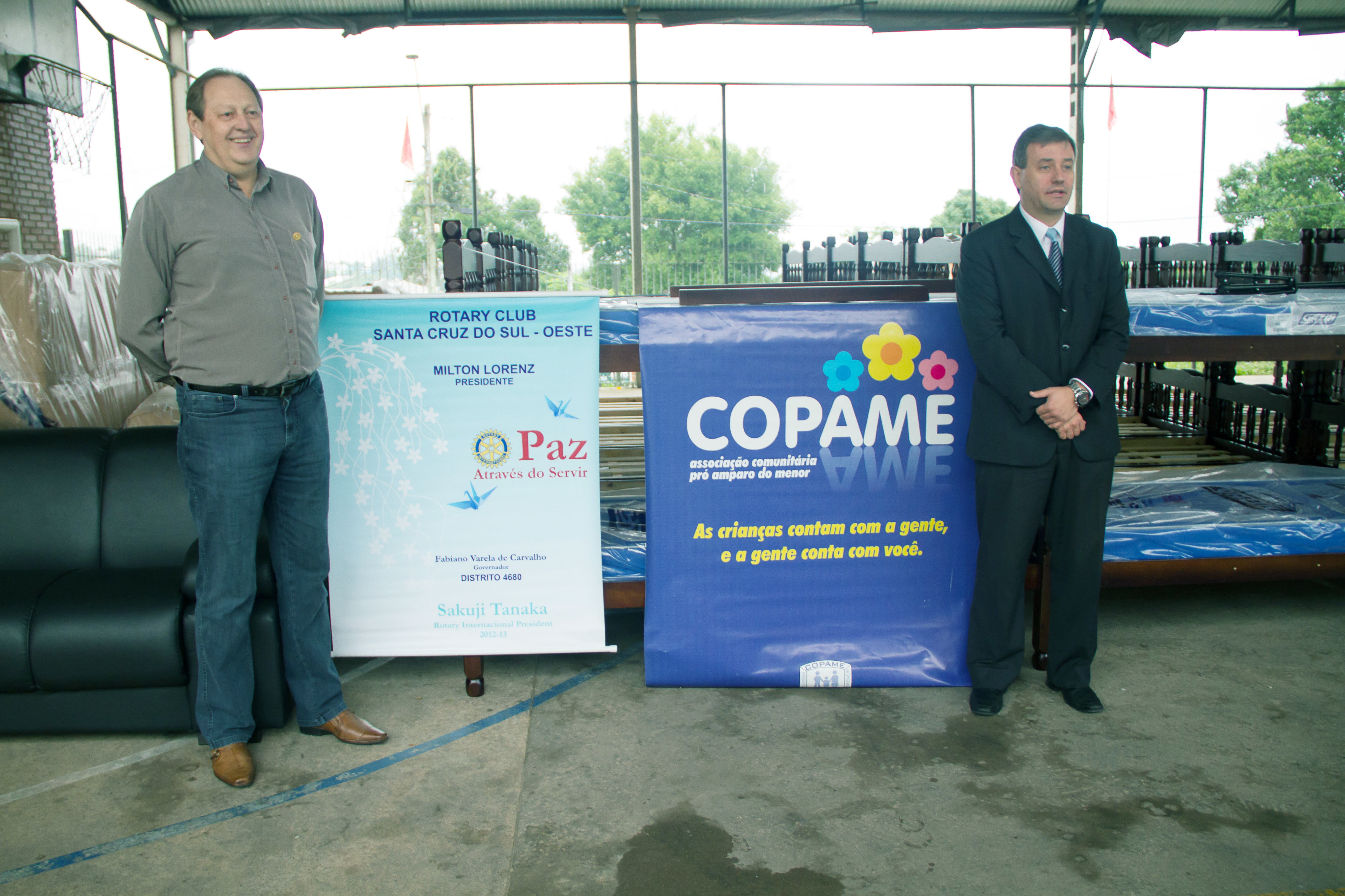 Na manhã da terça-feira, 2 de outubro, a Associação Pró-Amparo do Menor (Copame) recebeu uma série de doações. Trata-se de 18 beliches e colchões, bem como 8 conjuntos de sofás de couro, adquiridos com a venda dos ingressos do 12º Rotary Lions Fest, que acontece na noite de hoje, 5 de outubro.