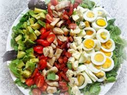 Preparando a salada: disponha o mix de folhas em um prato próprio para salada e acomode sobre as folhas, alinhados, os outros ingredientes: abacate, tomate, frango, bacon, queijo e ovos (não necessariamente nesta ordem).