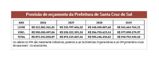 O secretário citou também desafios do orçamento para cumprir com os compromissos da campanha eleitoral do prefeito Sérgio Moraes (PL) e do vice Alex Knak (MDB), como as obras da Unidade de Pronto Atendimento (UPA) da parte alta da cidade, estacionamento subterrâneo no Centro e pavimentação de ruas. Para 2026, Santa Cruz deve contar com quase R$ 873 milhões em receitas, sendo R$ 322 milhões em recursos livres.