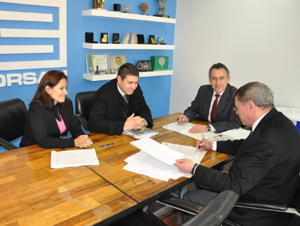 Nesta quarta-feira, 2, aconteceu a assinatura do contrato entre a Prefeitura e a Corsan. Ao centro da foto, o diretor-presidente da companhia, Arnaldo Dutra, e à direita o prefeito Telmo Kirst