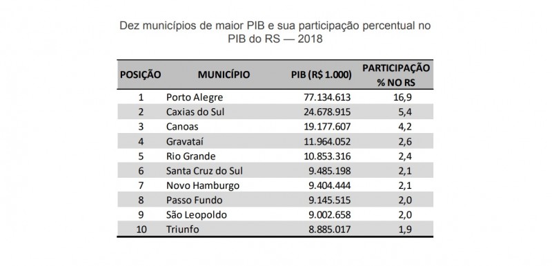 E assim como em 2017, em 2018 o Rio Grande do Sul permaneceu com quatro cidades no ranking das 100 maiores economias do país. Porto Alegre se manteve na sétima posição no país, seguida no Estado por Caxias do Sul (que pulou de 40ª para 37ª), Canoas (de 47ª para 49ª) e Gravataí (de 79ª para 89ª).