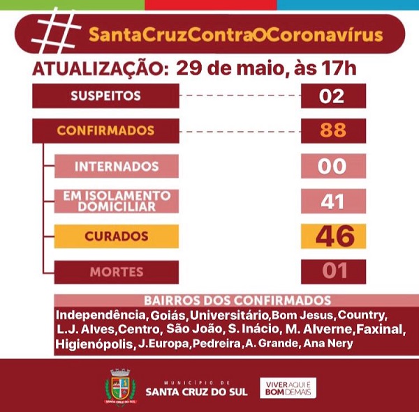 Em boletim divulgado no fim da tarde de sexta-feira, 29, pela Prefeitura de Santa Cruz do Sul, já são 88 pessoas infectadas pelo novo coronavírus no município. Destas, 46 pessoas já são consideradas curadas da doença.