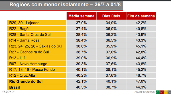 As regiões de Pelotas (44,5%), Porto Alegre (43,6%), Capão da Canoa (42,9%), Uruguaiana (41,5%) e Canoas (41%) são, pela ordem, as que apresentaram os melhores indicadores. Em algumas dessas áreas, o índice de isolamento beirou os 50% nos finais de semana.