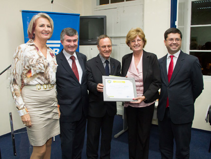 A gerente da unidade regional, Liane Klein; o superintendente estadual do Sebrae, Léo Hainzenreder e o diretor de Administração e Finanças, Marcelo Ribas fizeram a entrega do selo da Lei das Micro e Pequenas Empresas para a vice-prefeita Helena Hermany e para o secretário municipal de Desenvolvimento Econômico, Turismo, Ciência e Tecnologia, César Cechinato