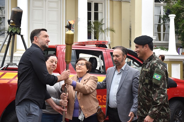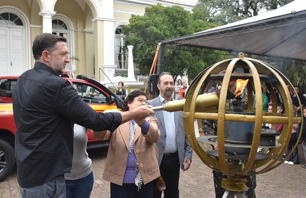 Santa Cruz do Sul deu início às comemorações da Semana da Pátria na manhã de ontem, com o tradicional acendimento da pira, em cerimônia na Praça da Bandeira. O ato contou com a presença de autoridades civis e militares, servidores municipais, escolas, representantes das entidades organizadoras, comunidade e imprensa. A chama do fogo simbólico foi conduzida pelo 6º Batalhão de Bombeiros Militar, familiares do homenageado deste ano, o músico Carmo José Gregory, representantes dos escoteiros e pela Banda da Emef Bom Jesus.